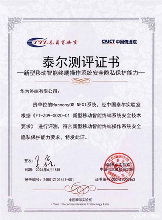 中国信通院为华为新操作系统HarmonyOS NEXT颁发评估证书