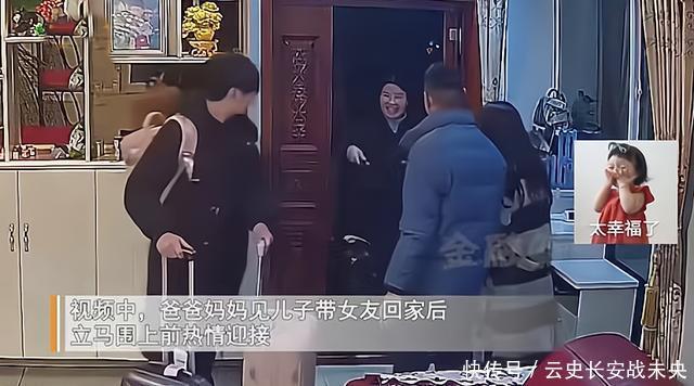 爸妈站在门口热情迎接,首先走进来的是他们的宝贝儿子,这是一位阳光帅气的小伙子,容貌端正,仪表堂堂,他手里推着两个行李箱,身后跟着一位年轻漂亮的姑娘。