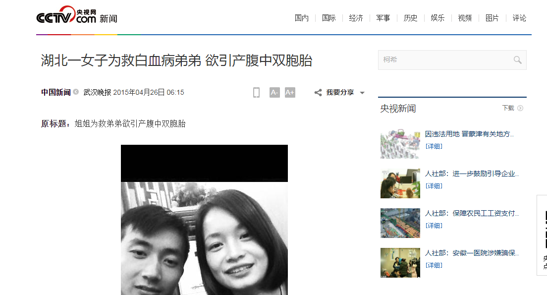 《湖北一女子为救白血病弟弟 欲引产腹中双胞胎》——央视网 2015年4月26日发布