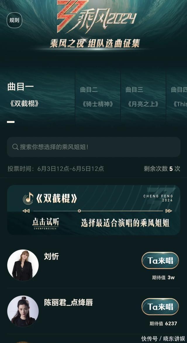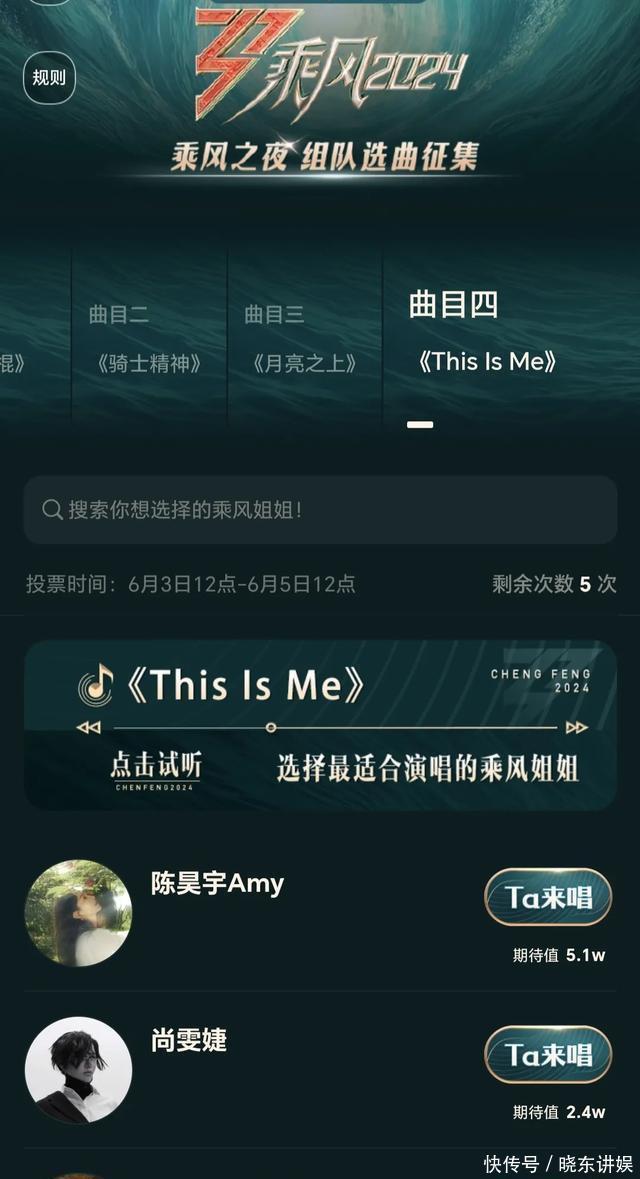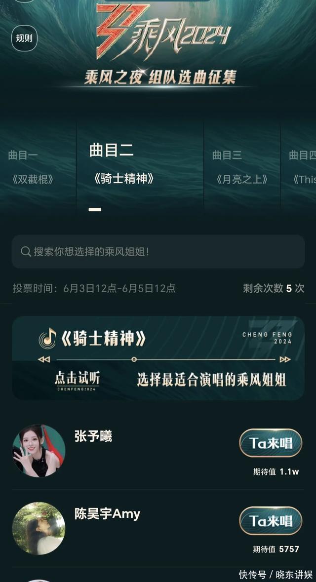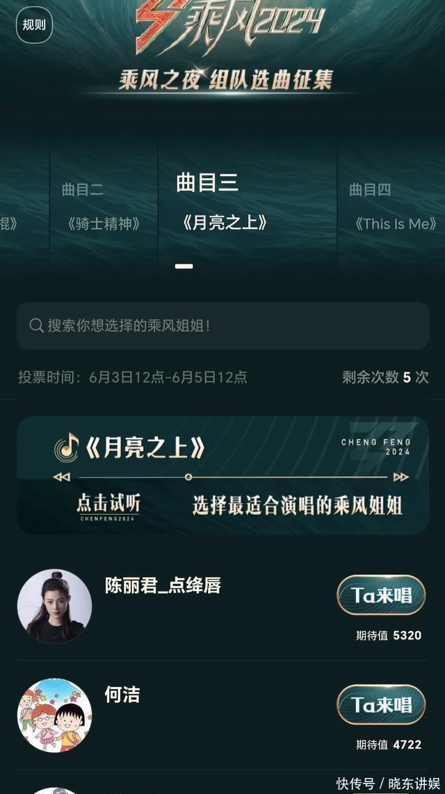 《浪姐5》成团夜歌曲投票,陈昊宇排名第一,张予曦意外上榜