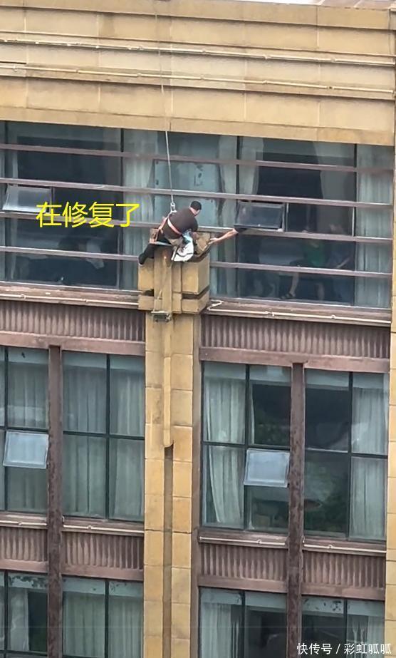 女子被砸后第二天,就有人来修复损坏的外墙了。