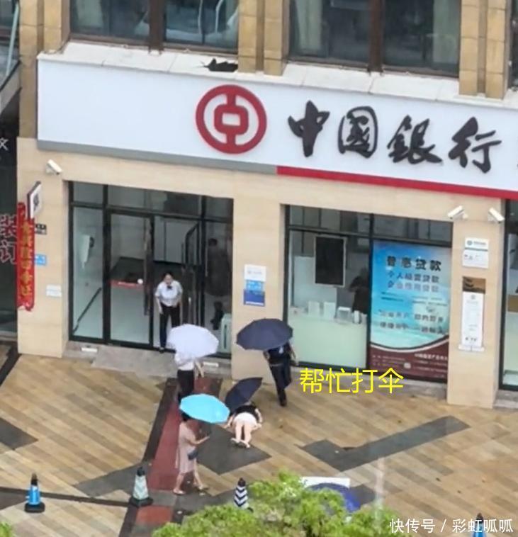 银行的工作人员,只能去里面,拿出雨伞,几个人站在原地,帮女子打伞,还打了120,他们能做只能这样了。
