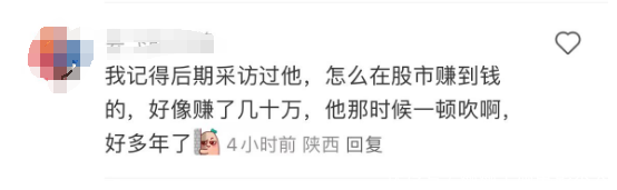 除此之外,在评论区还有网友爆料:“好多年前我还采访过他,他还跟我吹嘘他当时你在股市赚了几十万,现在估计生活也不算太难过吧,毕竟瘦死的骆驼比马大。”