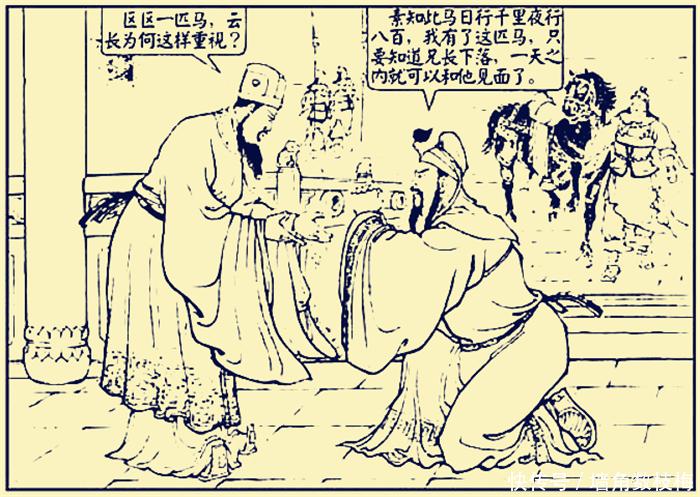 当时一次宴会后,曹操送关羽出府,看到关羽的战马又瘦又小,他灵机一动,令人将战利品“赤兔马”牵来,送给关羽。赤兔马乃是天下第一马,无论哪一个武将看到之后,都会爱不释手。当年的吕布为了赤兔马,杀了义父丁原,改投董卓,现在的关羽,也不例外,看到赤兔马后,眼前一亮,当即向曹操拜谢。曹操心中不解,询问关羽区区一匹马,为何如此郑重其事拜谢。关羽道出了原因:“吾知此马日行千里,今幸得之,若知兄长下落,可一日而见面矣。”