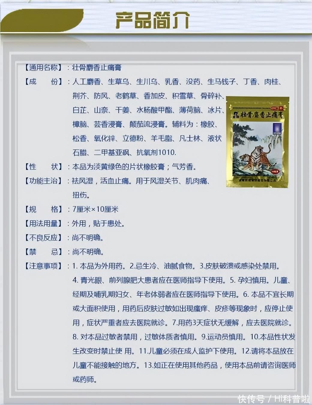 一般情况下,中药类止疼贴膏中的有效成分是麝香,而非虎骨,包装上印虎是利用了中国传统文化中对虎威猛、凶狠、强壮寓意的心理暗示。所以,膏药类产品的注意事项一栏中,一般都会标明“孕妇慎用”字样。