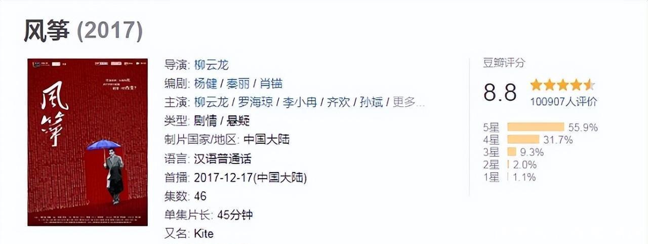 2017年,由柳云龙自导自演的年代谍战剧《风筝》上线,并于次年获得了金鹰奖电视剧作品奖荣誉提名。