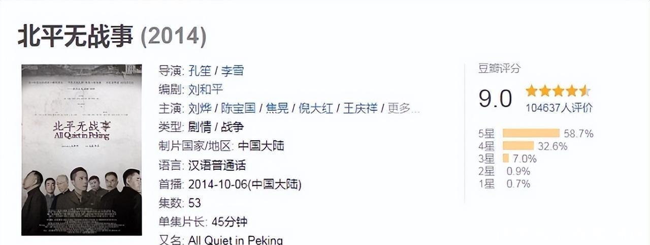 2014年,刘烨陈宝国倪大红等主演的《北平无战事》同时在北京天津河南山东卫视播出,19天中有10天占据收视榜首,被誉为当年的现象级“剧王”。
