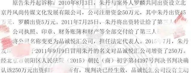 在之前的时间里,朱丹曾经担任过北京品诚悦汇文化传播有限公司的监事,而这家公司的法定代表人执行董事和经理,正是她的好友田笑蜜,而在朱丹担任监事的期间,两人之间就发生了一些公司股东资格的确认纠纷。