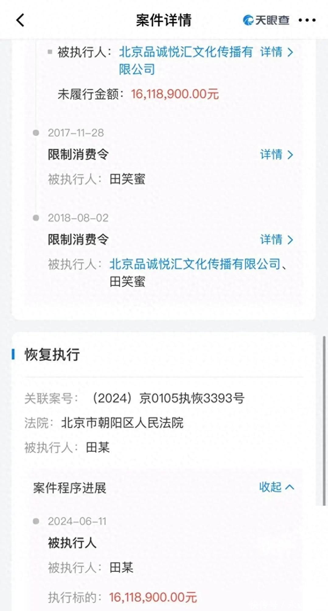 就在大家以为这件事情已经过去的时候,最近,根据天眼查的法律诉讼信息显示,朱丹的好友田笑蜜又有了最新的动态,她被执行了一笔巨额的债务,而这笔债务的执行标的高达1611万余元,而且这起案件还涉及到了朱丹与田笑蜜之间的一些合同纠纷。