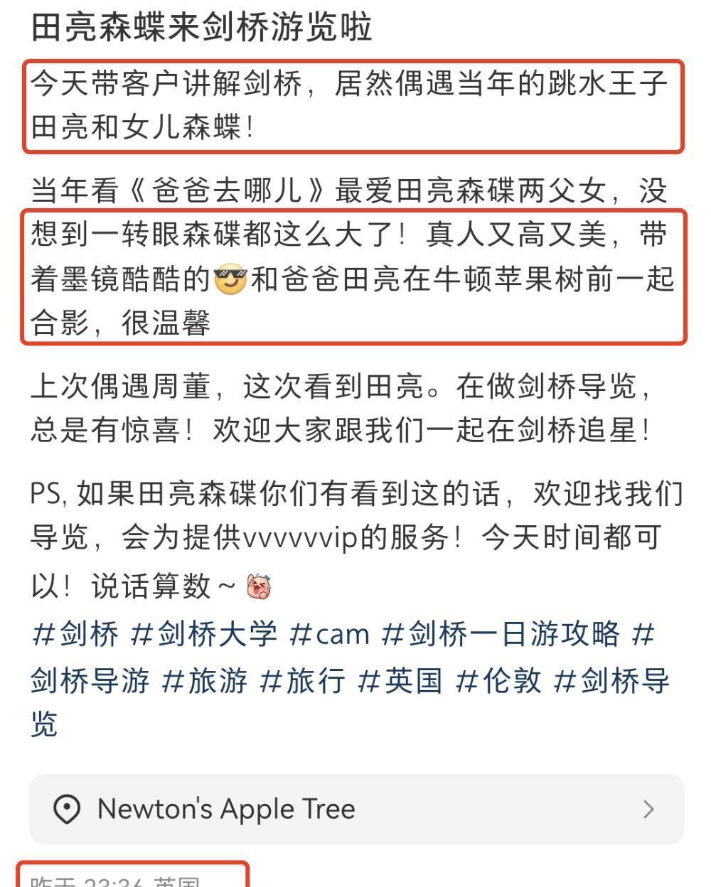 田亮带儿女参观英国剑桥大学,姐弟俩或有留学意向,森碟晒黑好多