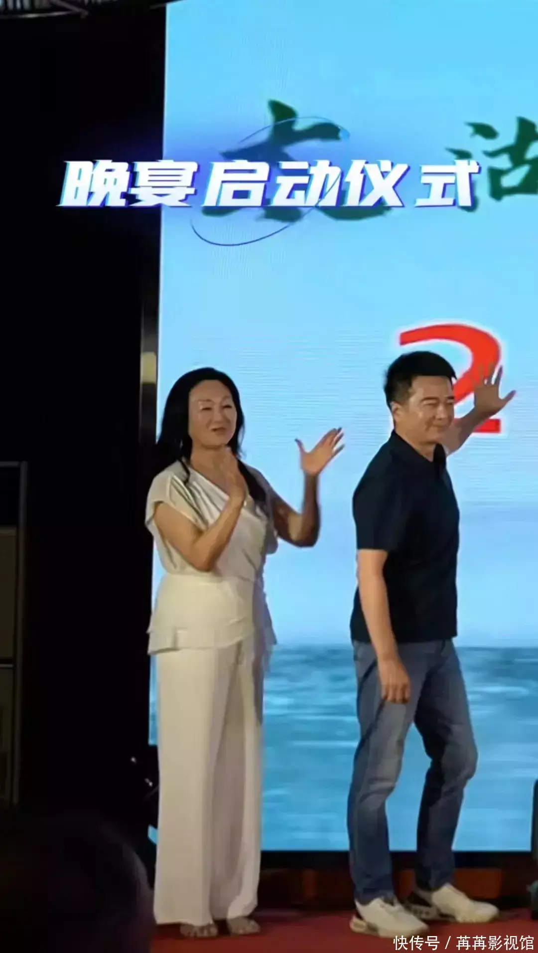 在这场晚宴仪式上,身穿蓝色短袖的许亚军与王姬一同登上舞台,两人手按大屏幕,宣布晚宴启动仪式开始。
