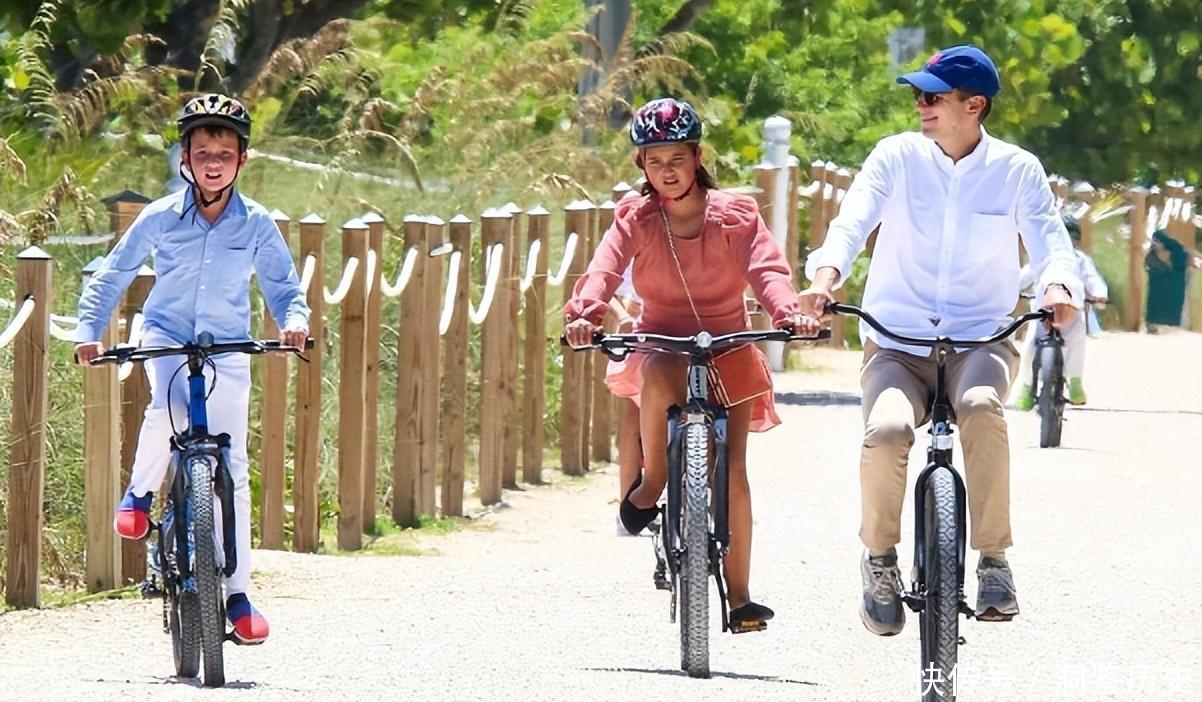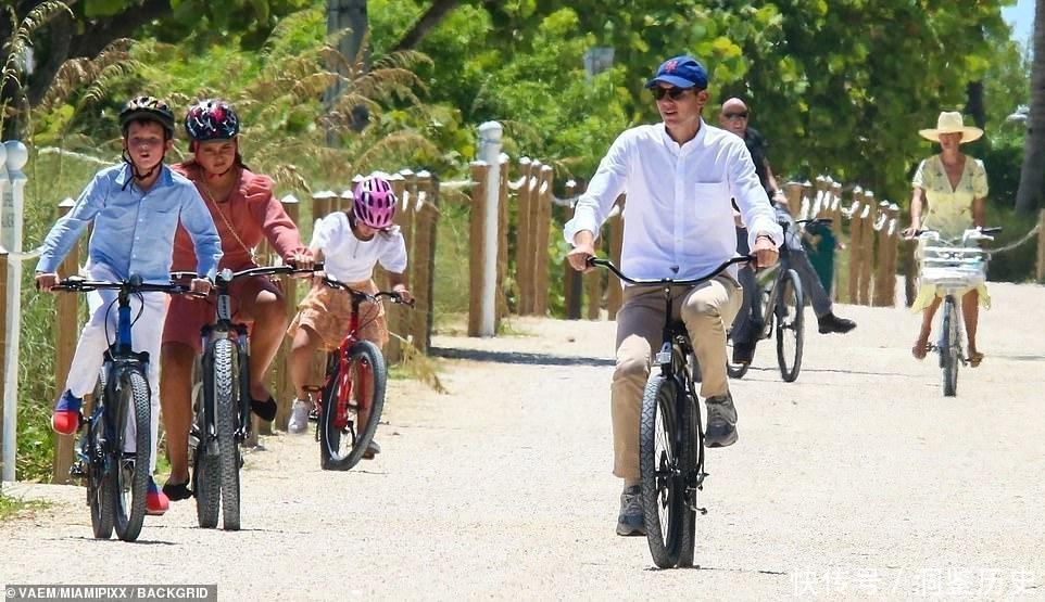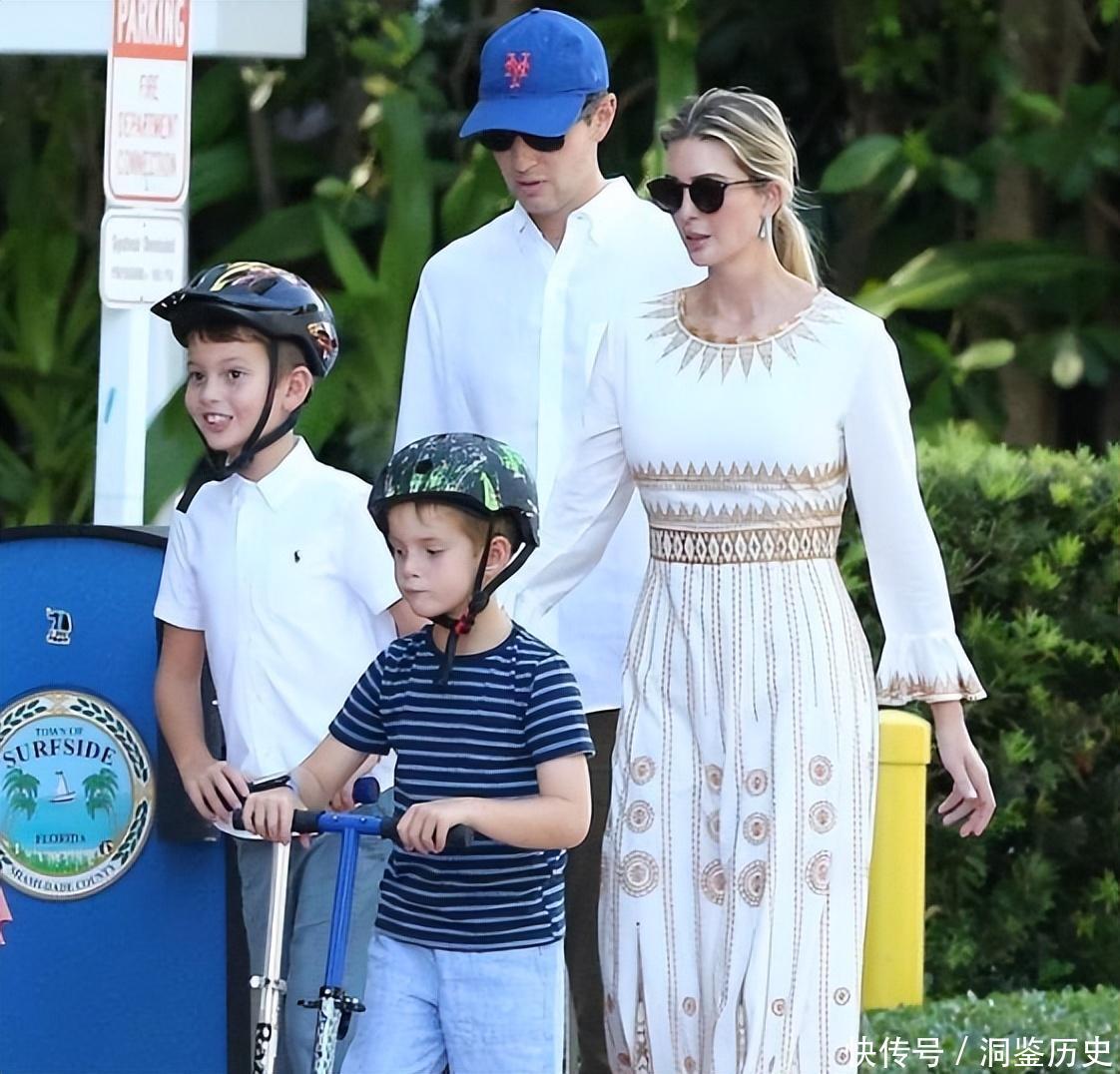 而她身边的爱人贾里德·库什纳,则是穿着一条白色衬衫,搭配着一顶标志性的蓝帽子,看起来非常的儒雅,他带着三个孩子一同开心的骑行,一看就是个好爸爸。