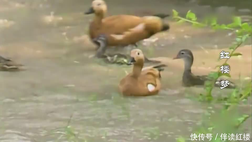 宝玉跑回怡红院,见院门紧闭,任由他把门拍的山响,也没人来开。原来怡红院内大家玩得正开心。梨香院的小戏子端午节放假,进大观园来玩,龄官到蔷薇花下画蔷。小生宝官、正旦玉官等两个女孩子,正在怡红院和袭人玩笑,被雨阻住。袭人、晴雯、麝月等大家堵住水沟,院里积满了水,成个大水池,弄些绿头鸭子、鸳鸯放在水里玩。外面下着大雨,水沟堵着门也关着,大家玩得兴高采烈。