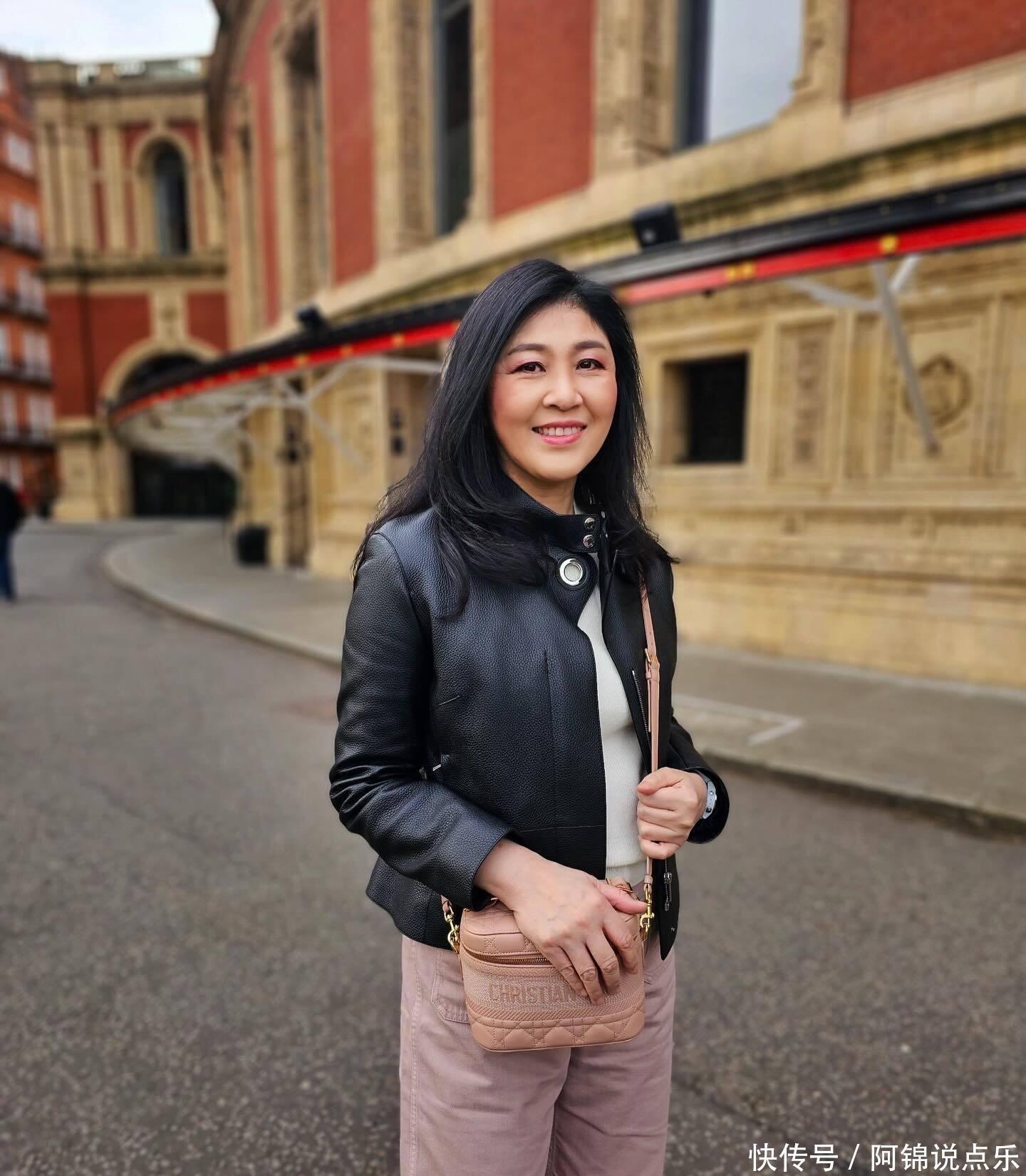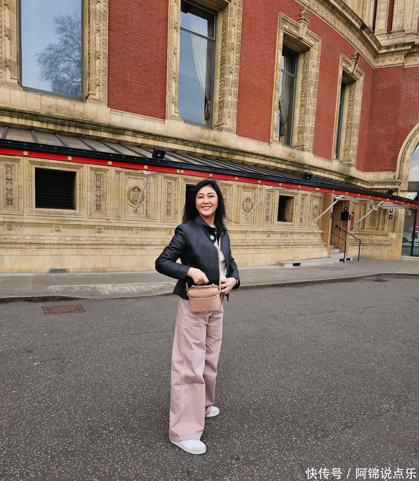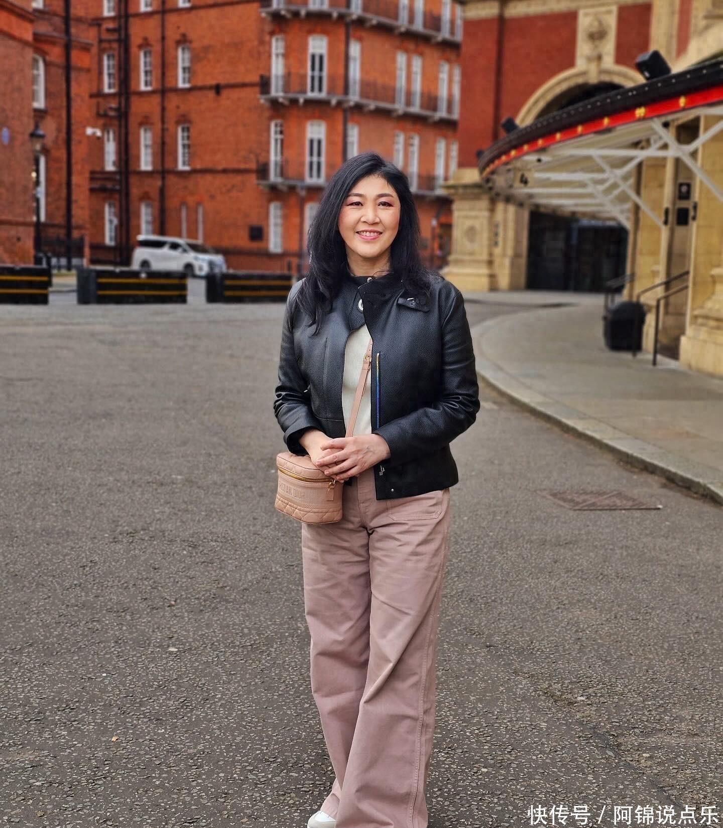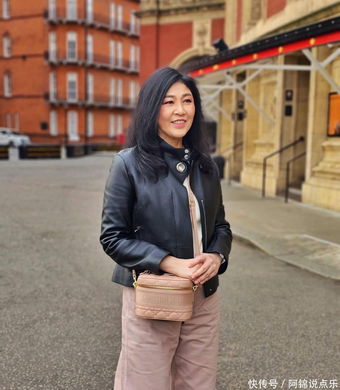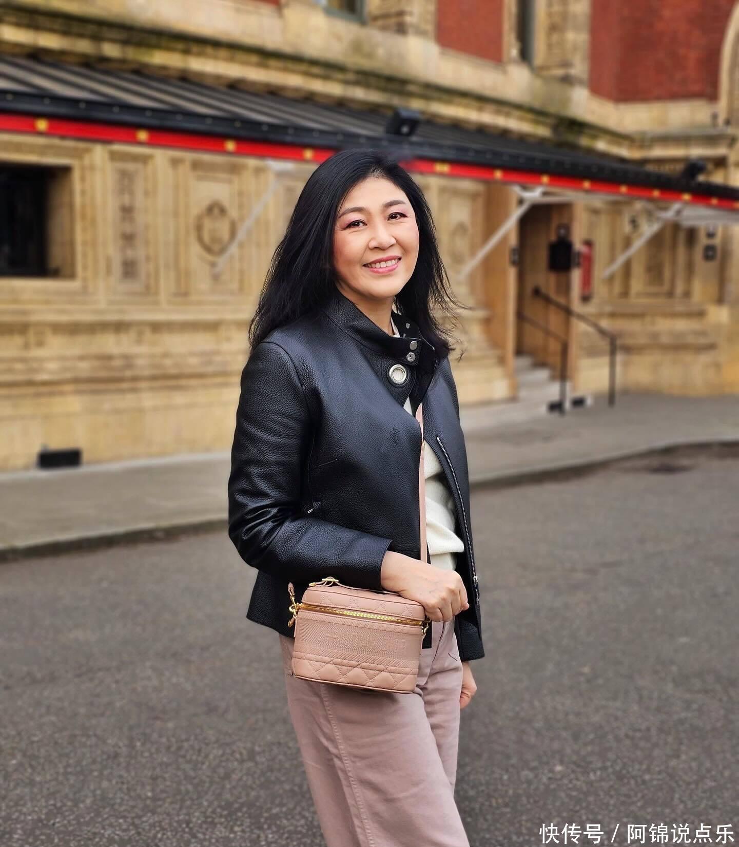 英拉56岁英国新照曝光!黑皮衣配粉包,温柔又减龄