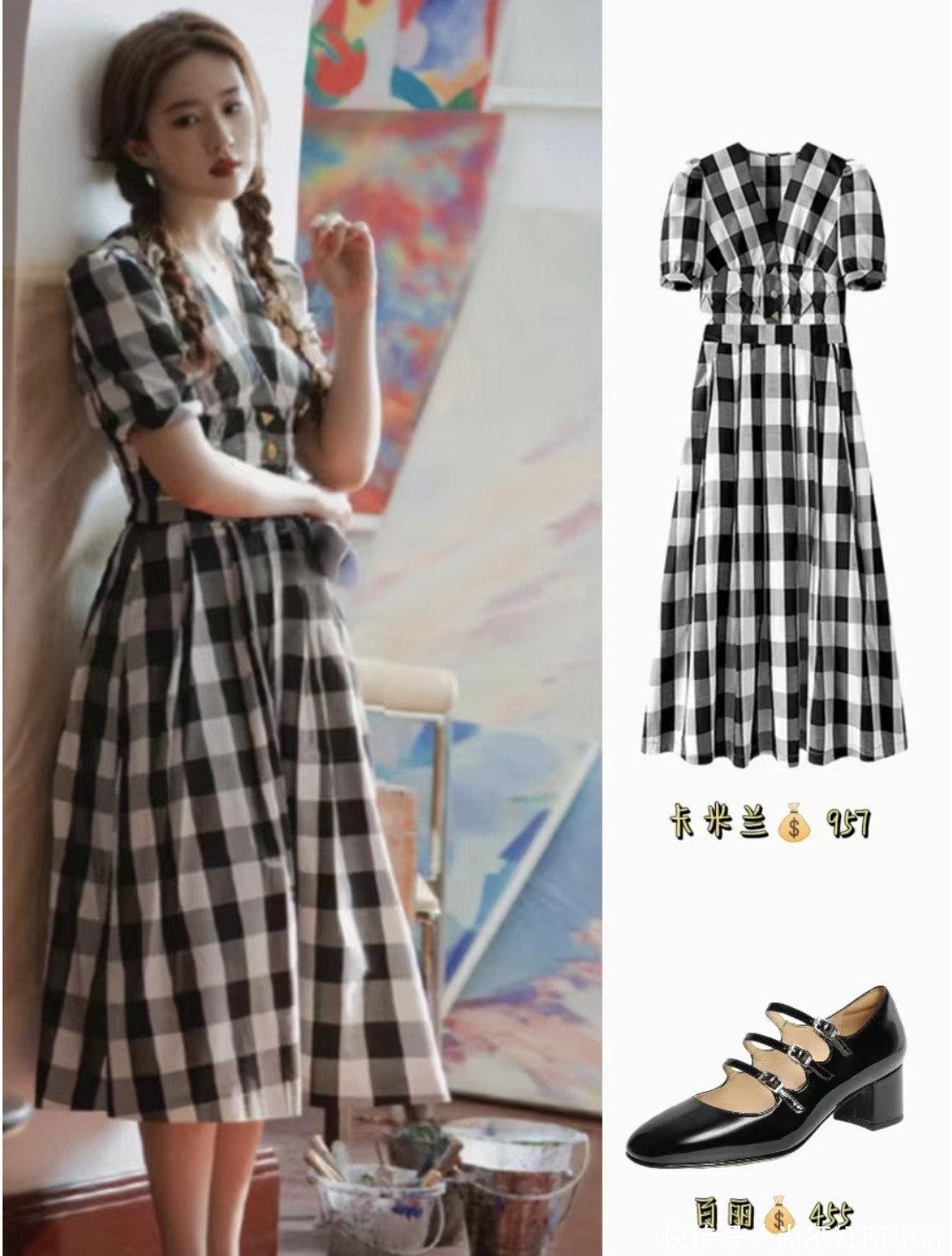 look4:法式黑白格纹连衣裙搭配黑色珍珠鞋,落落大方,非常适合日常通勤。