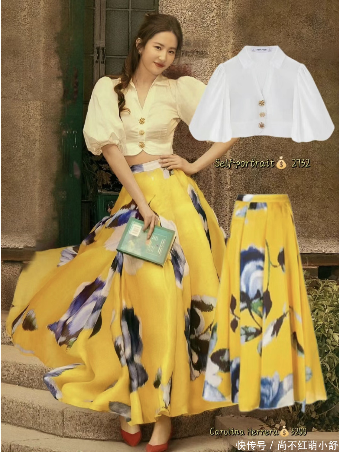 look2:立体泡泡袖衬衫+印花半身裙,彰显从内到外的气质,光看这小蛮腰,网友们就表示:身材真好,羡慕了~