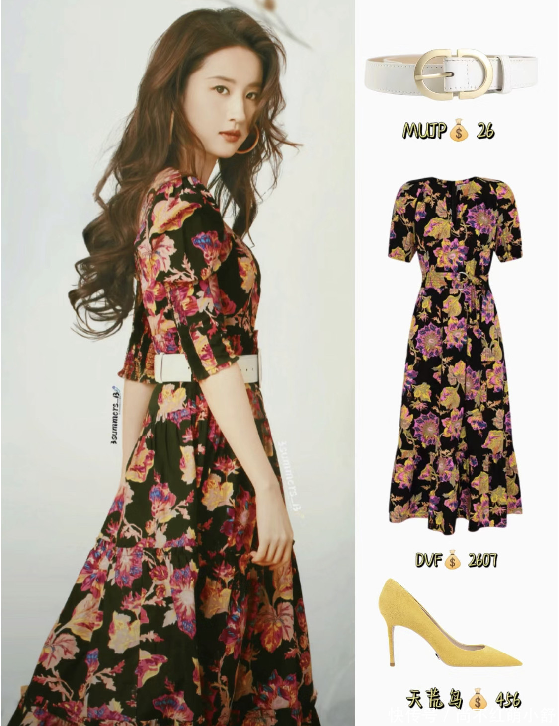 look3:黑红碎花的连衣裙搭配大波浪,腰带修饰身材比例,这样的搭配也是职场比较受欢迎的穿搭。