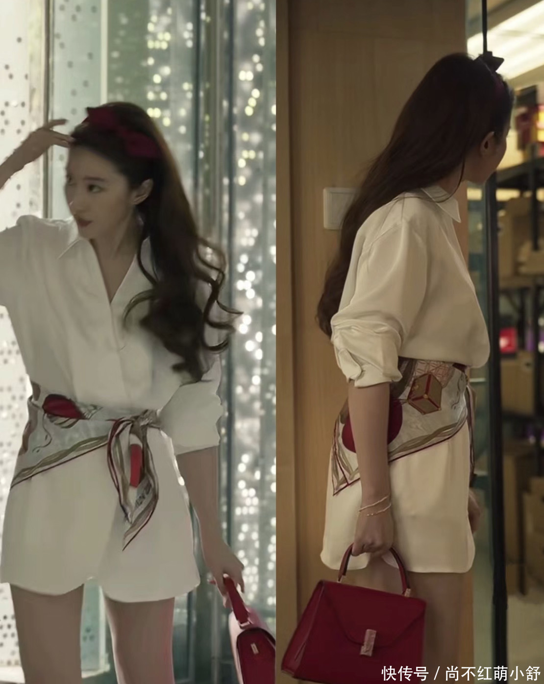 在本剧中,刘亦菲的配饰也很亮眼,粉色、玫红色、银黄色、豆绿色、紫色、红色、黑白都是黄衣玫的主。这套衬衫打扮,就采用了红色的发夹,丝巾以及红色的包包进行撞色,与白色服装搭配相得益彰,这也太时髦了吧。