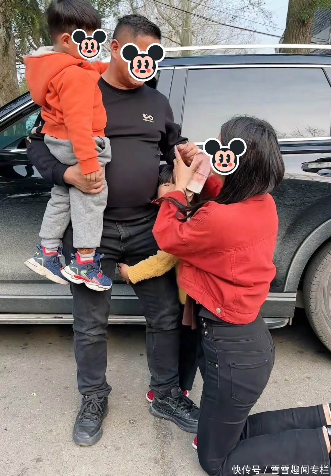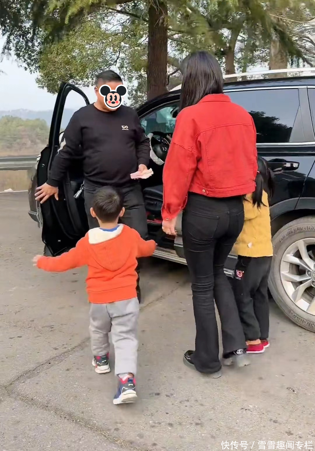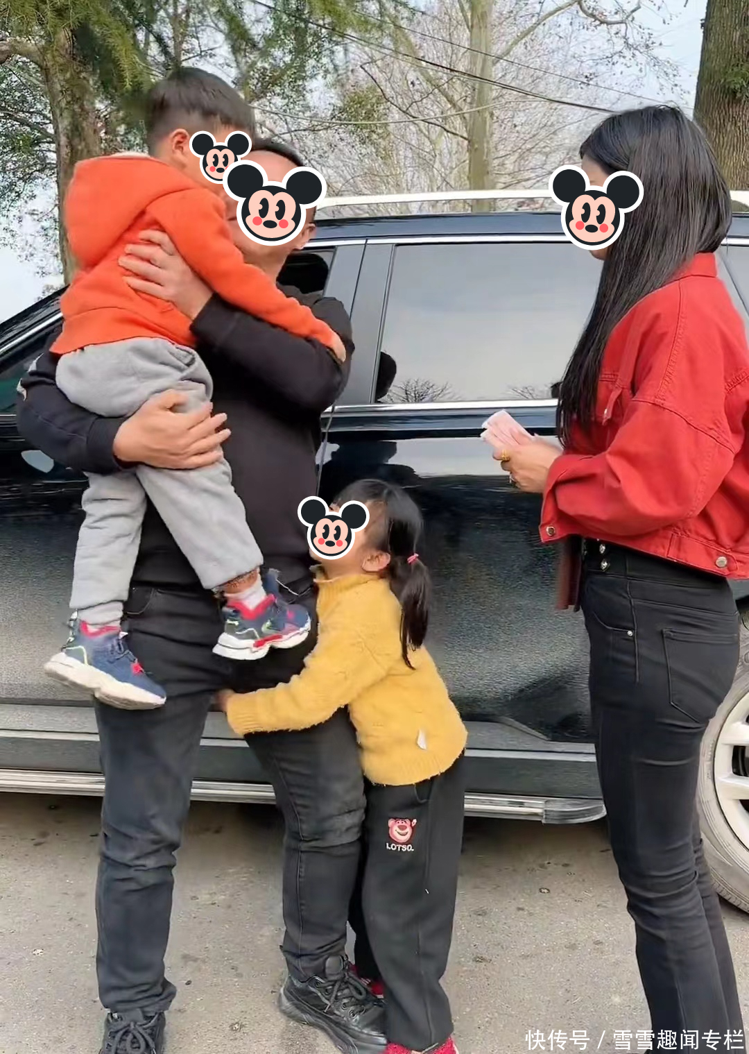 有一天,邻居大哥像往常一样,结束了一天的工作后,回到老家看望他们,他把车停好后,女子带着两个孩子上前跟他打招呼。