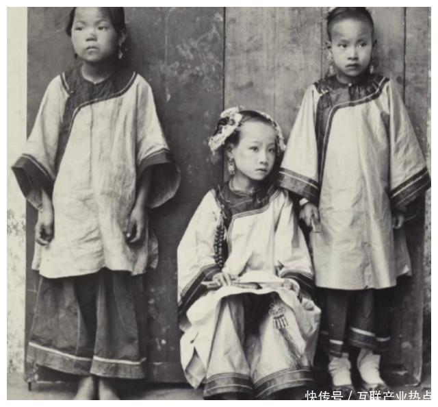 该照片拍摄于晚清时期的一个富裕家庭,照片中的三个女孩年龄相仿,但待遇却天差地别。中间坐着的大户人家的小姐,两侧的站着的则是小女孩的贴身丫鬟。