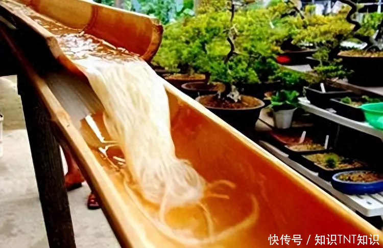 日本的奇葩吃面方法,把面放进长长的石槽,顺着水流从上往下飘,客人站在水槽旁,谁捞着谁吃。