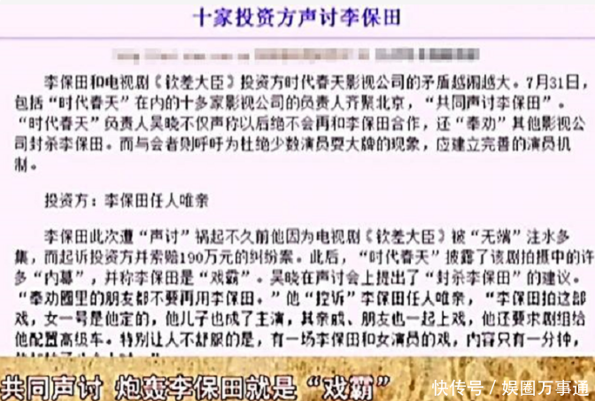 投资方自然也不是好惹的联合多家投资方声tao起了李保田,并给他按上了“戏霸”的条约,对于这件事很多不明所以的网友也觉得是李保田太小题大做了。