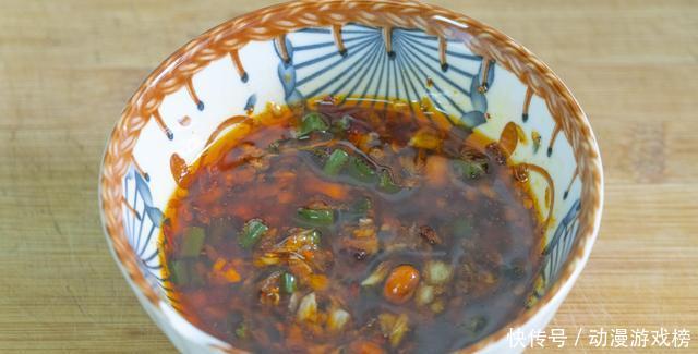 6、大蒜半头,拍碎后装入碗里,加少许盐捣成蒜泥,接着加酱油、醋、生抽、香油,辣椒油,葱花,拌匀后就可以了。