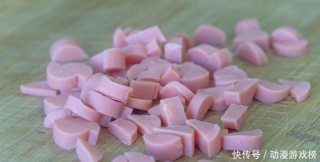 3、火腿肠2根,从中间一分为二后也切成小丁。
