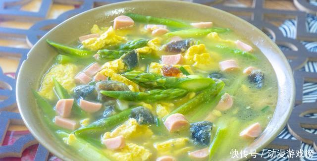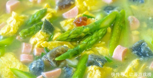 5、再起锅热油,下葱姜蒜,爆香后倒入皮蛋和火腿肠。炒香后倒入一大碗开水,芦笋和鸡蛋倒进来后简单地调个味,盐、鸡精、胡椒粉。