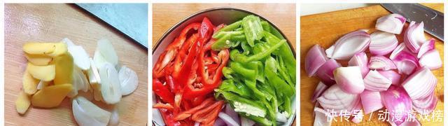 3、生姜切成片,大蒜切成片,准备两个青红椒斜着切圈,洋葱切块,全部切好之后装入盘中;