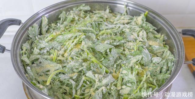 4、接着将拌好的面粉撒在茼蒿上面,再轻轻的抓拌均匀,水开后将茼蒿放进来,放进去的时候要松散一些,不要堆的太紧实了,也千万不要按压,水开上汽后,大火蒸5分钟,面粉蒸熟了就可以了。