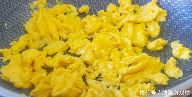 4、碗里打入3个鸡蛋,加一勺盐后搅散,起锅热油,先倒入蛋液滑散,炒成鸡蛋碎后盛出来。