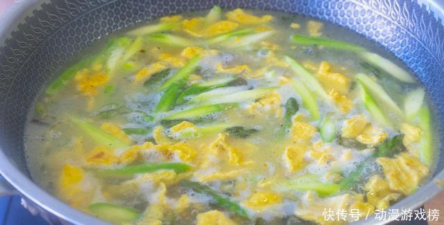 6、大火煮开后转小火再煮2分钟,芦笋煮熟后撒上小葱花,就可以关火出锅了。