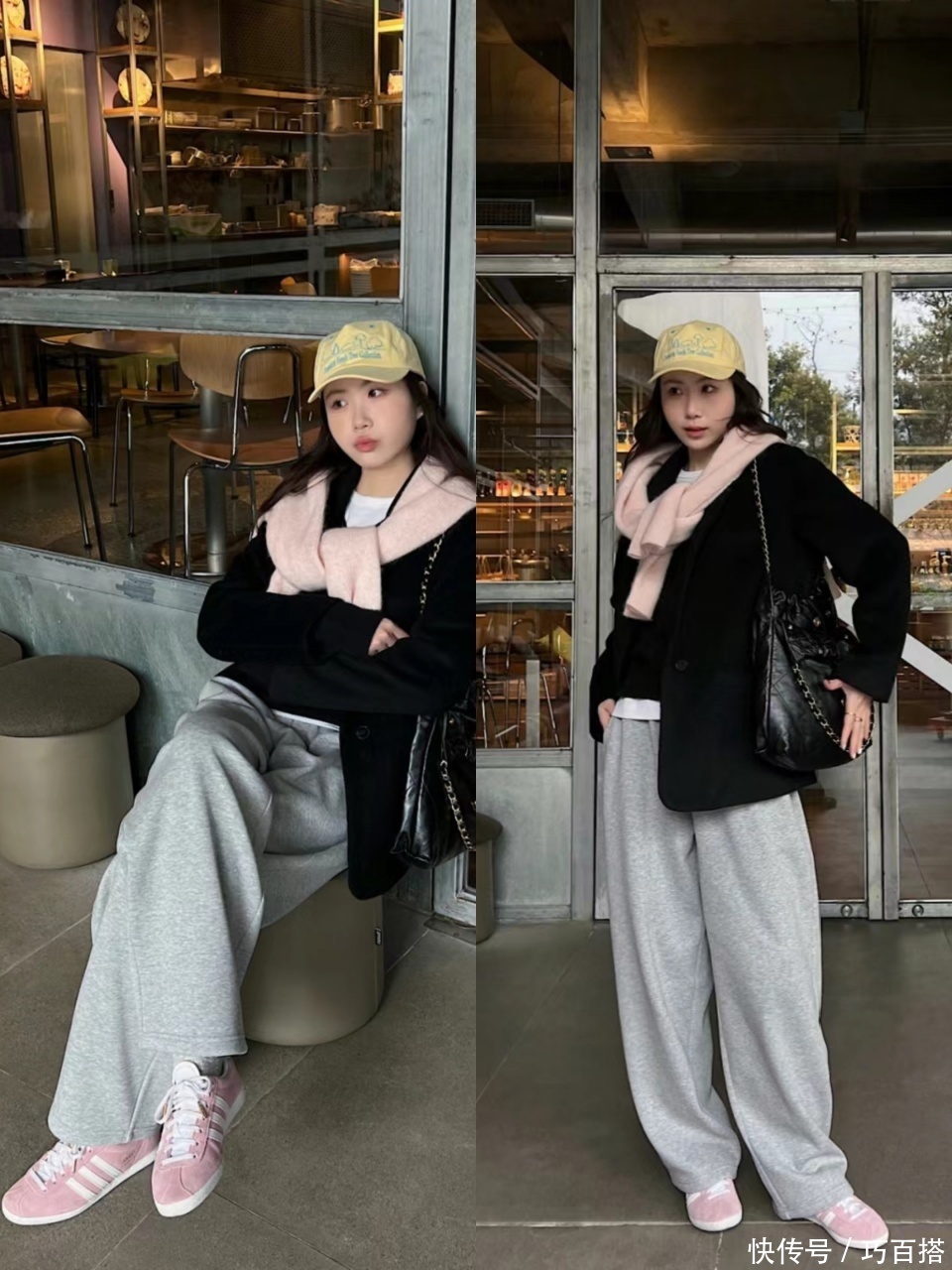 很聪明的是博主直接选择粉色围巾与之搭配,上下颜色形成呼应,整体性一绝,这种情况下,无论上衣和下装到底选择哪种色系,在氛围感的呈现上都是说得过去的。
