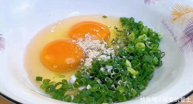 步骤2:接下来我们切上一小把葱花放入盆中,打入两个鸡蛋,调味料放入一些胡椒粉增加一下底味,然后用筷子给它搅拌均匀,将鸡蛋液打散和葱花搅匀在一起