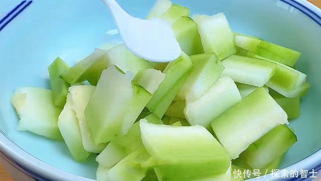 步骤1:准备一块切好的冬瓜,把外面的一层皮削掉后,给它切成大小匀称的冬瓜块,放入盆中用清水给它冲洗一遍,然后将冬瓜沥干水分,往装有冬瓜的盆里放入一勺食盐,将冬瓜抓均匀给它腌制制个10分钟,这里我们腌制的目的是为了将冬瓜里的大量水分腌制出,在以便我们在后续的冬瓜块制作里,起到避免出水的作用