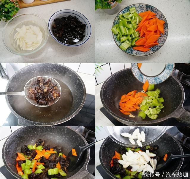1、木耳提前泡发。山药洗净去皮后切成片碗中放清水加几滴白醋将山药片浸泡。