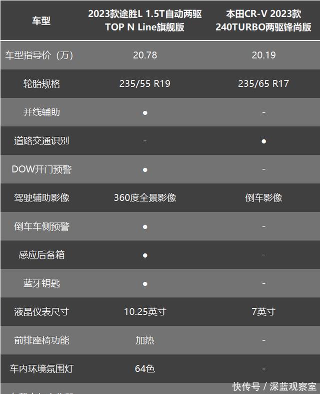 将其和价格相近的本田CR-V做对比,指导价相近的前提下,第五代途胜L在智能化、实用性和舒适性配置上优势明显。