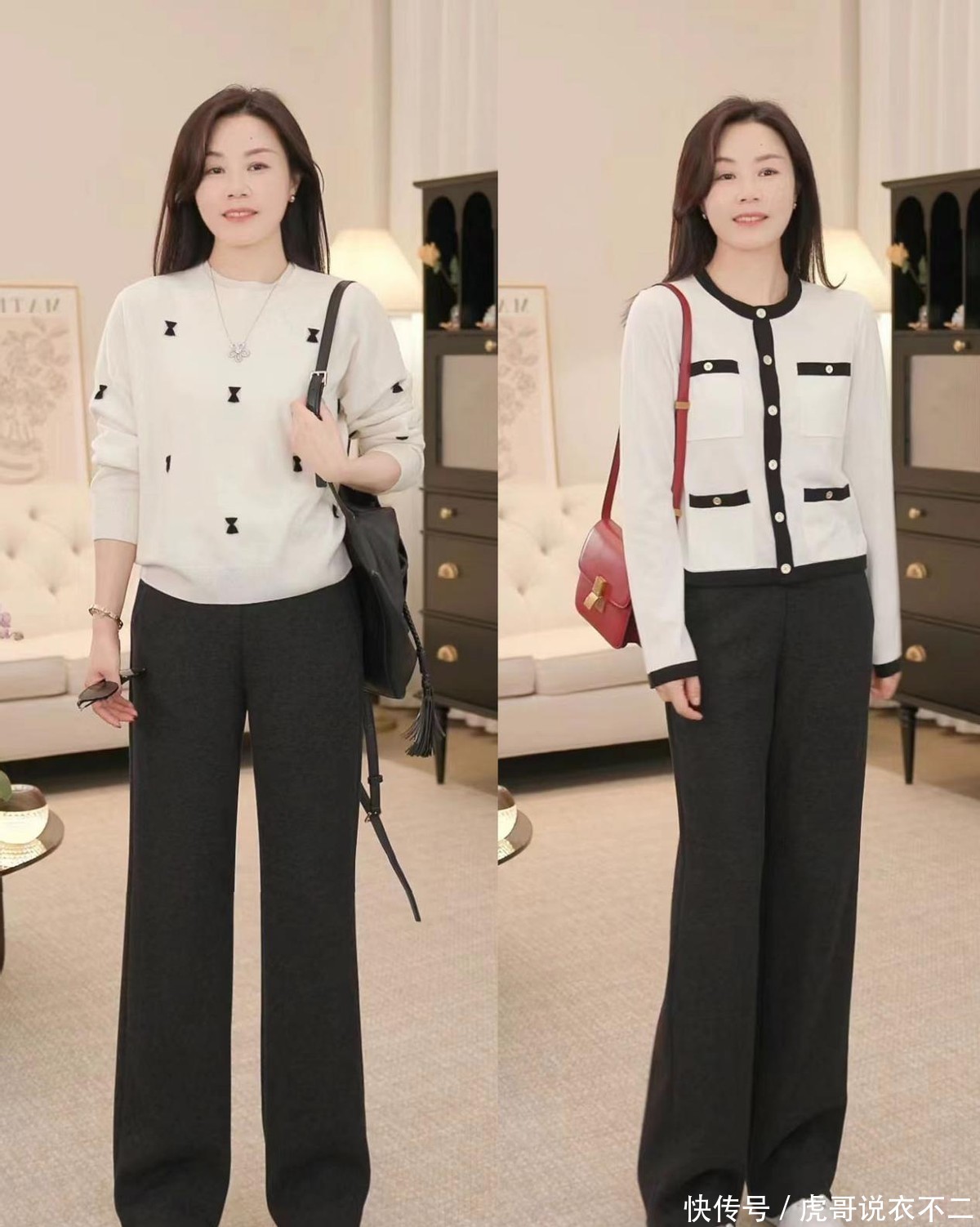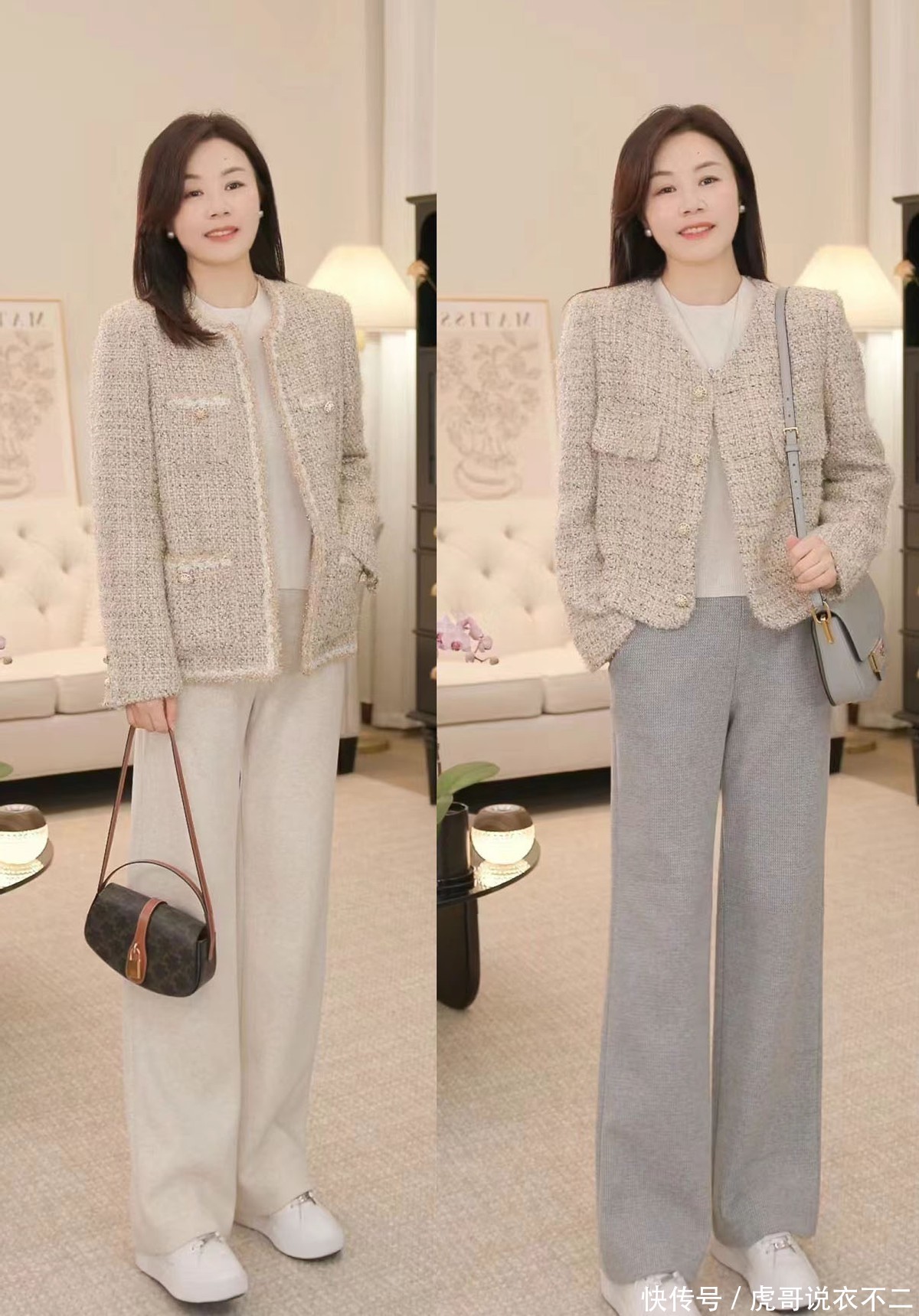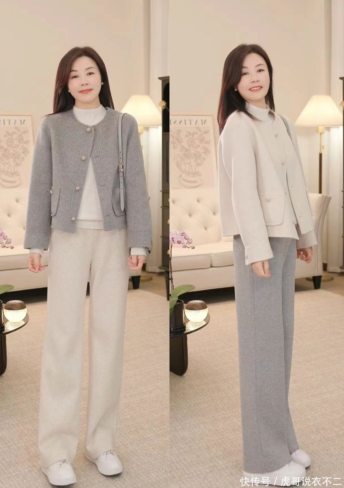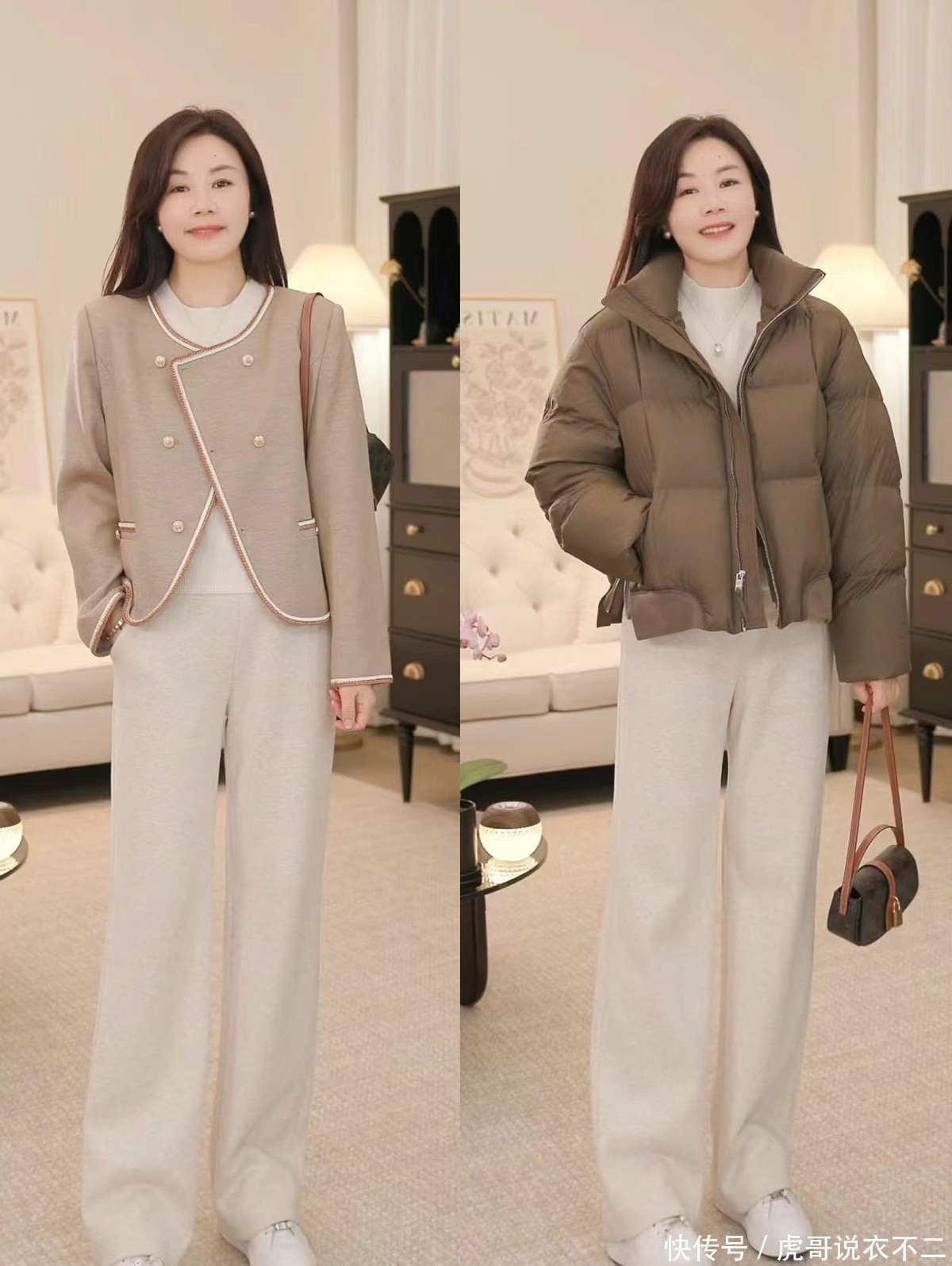 过了40岁的女人,早春都建议试试“短上装+直筒裤”,显瘦又时髦