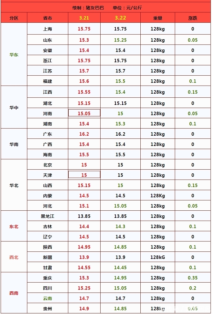据数据分析,在生猪市场,受阶段性多空调整,3月22日,外三元生猪价格出栏均价在14.98元/公斤,下跌0.06元,猪价冲高回落,南北多地承压“飘绿”,不过,猪价降幅有限,主流地区屠企报价下跌0.05~0.1元/公斤,仅有西南川渝地区,猪价下跌较为明显!